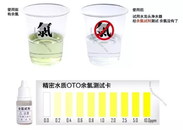 净水前后的余氯量对比 净化前的自来水含余氯 颜色偏黄,证明有余氯 净化后的水几乎不含余氯 颜色纯净,几乎不含余氯